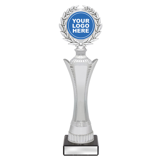 Elegant series of holder style trophies to showcase your club or event logo. Designs over multiple sizes with bright silver and black marble for engraving.