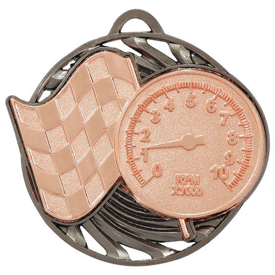 Medals designed for Motorsport present a generic theme with a racing flag and stop-watch. The Vortex Medal series is an innovative design featuring bright elements on an antique vortex whirl design. Back of the medal includes a rectangle panel for your engraving. Special medal boxes available for this uniquely shaped medal.