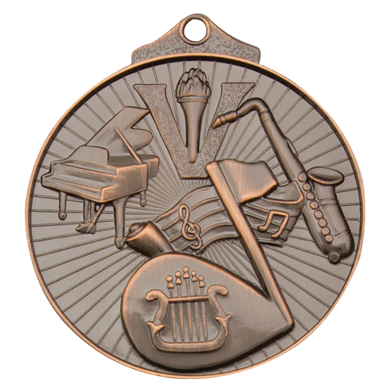 Antique gold, silver and bronze medals for Music. A classic design, the Sunraysia Medals feature iconic and common elements for music including notes and instruments. Medals feature an extra thick edge and a rectangle panel on the back of the medal for your engraving.