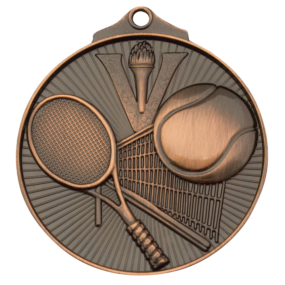 Antique gold, silver and bronze medals for Tennis. A classic design, the Sunraysia Medals feature iconic tennis elements of the racquet, ball and net. Medals feature an extra thick edge and a rectangle panel on the back of the medal for your engraving.