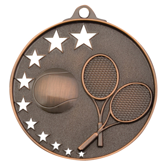 Bright gold, silver and bronze medals for Tennis. A popular medal series, the Star Series features a unique hollow multi-star design and extra thick edge. There is a rectangle panel on the back of each medal for your engraving. Ribbons available in all colours and plenty of medal boxes to suit.
