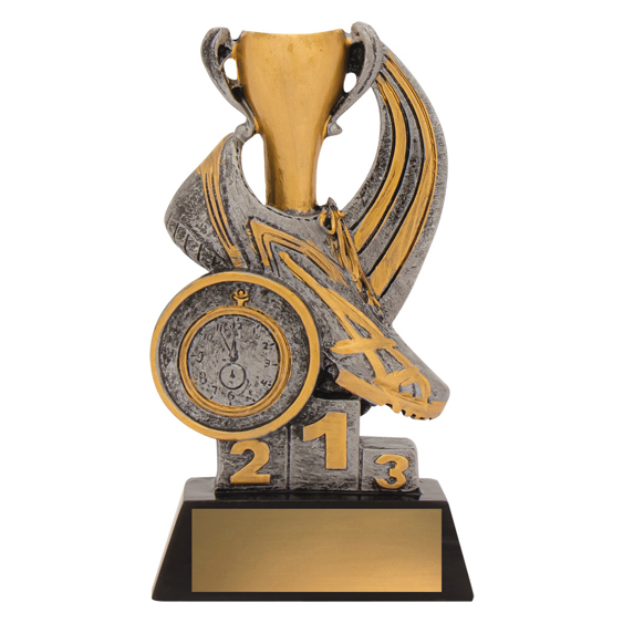 The Athletics Podium trophy presents a budget option with an appealing design of iconic track elements and finished in classic antique silver.