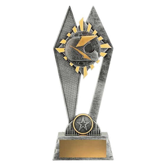 The Peak Series is an innovative set of trophies offering super value for such an impressive size range. An elevated design that showcases the distinct Motocross helmet against vibrant sunray background. Available in 3 sizes.
