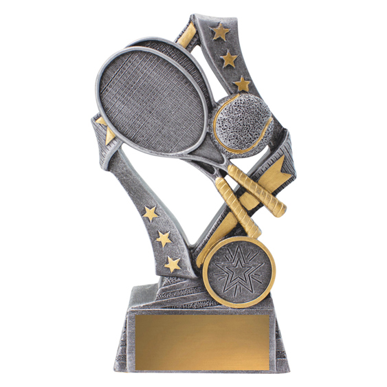 Dynamic tennis trophies perfect for male and female participants at your event. These 'Flag' tennis trophies feature a stylish star based design with iconic racquet and ball elements.